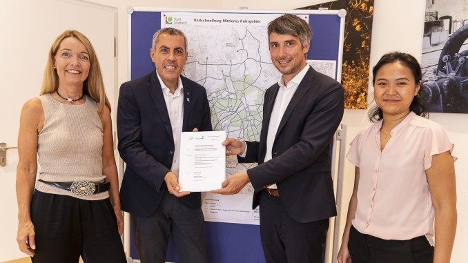 26.08.2022 – Radschnellweg – Am Freitag (26.8.) unterzeichneten Ahmed Karroum, Leiter der Straßen.NRW-Regionalniederlassung Ruhr, und Stadtbaurat Dr. Volker Kreuzer gemeinsam mit Bürgermeisterin Bettina Weist eine Planungsvereinbarung für den Radschnellweg Mittleres Ruhrgebiet (RS7). Das etwa 3,3 Kilometer lange Teilstück des RS7 zwischen der Talstraße und der Bottroper Straße in Gladbeck wird vorwiegend über die Trasse einer ehemaligen Zechenbahn führen. Die Stadt Gladbeck wird den Umbau im Auftrag des Landesbetriebs planen.
