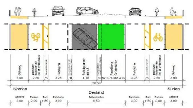 „Statt standortprägender Bäume wird man im Grünstreifen demnächst standortprägende Parkplätze mit vielen Autos vorfinden. Der Charakter der Straße wird sich deutlich verändern.“