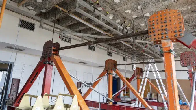 Für den Druckbelastungstest im Riesener-Gymnasium hat die Fachfirma ein Stahlrahmensystem installiert. Mithilfe verschiedener Hydrauliksysteme belastete man die Decke des Gymnasiums mit mehreren Tonnen und das jeweilige Bauteilverhalten ist nun sensorisch aufzeichnet. Die Ergebnisse dokumentierte man dabei mit einer Präzision im Bereich eines tausendstel Millimeter. Während des Versuchs wurden Belastungen und Entlastungen durchgeführt, um sich der Tragfähigkeit der Decke anzunähern.