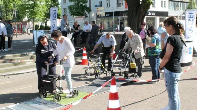 Darüber hinaus stellt die Vestische Straßenbahnen GmbH einen Linienbus zur Verfügung, an dem das Ein- und Aussteigen sowie das richtige Verhalten im Bus geübt werden kann. Experten der Verkehrswacht Recklinghausen-Land überprüfen vor Ort die mitgebrachten Rollatoren auf Verschleißteile und körpergerechte Höheneinstellung. Auch diese Faktoren können zu einem unsicheren Umgang mit dem Rollator führen. Der Kreis Recklinghausen bietet unter anderem die Möglichkeit, die Rollatoren mit Reflektoren zur besseren Sichtbarkeit bei Dunkelheit auszustatten.