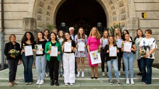 23.06.2022 – Junge Erwachsene übernehmen ein Jahr eine Patenschaft für ein Kind im Grundschulalter. Bürgermeisterin Bettina Weist hat 15 Schülerinnen der Ingeborg-Drewitz-Gesamtschule und des Heisenberg-Gymnasiums für ihr tolles Engagement die Ehrenamtsurkunden des Landes NRW übergeben. „Trotz der außergewöhnlichen Herausforderungen durch die Corona-Pandemie haben die Schülerinnen den Kontakt mit ihren ‚Moglis‘ aufrechterhalten. Sie haben die Grundschulkinder in einem wichtigen Lebensabschnitt begleitet und konnten dabei viel voneinander lernen.