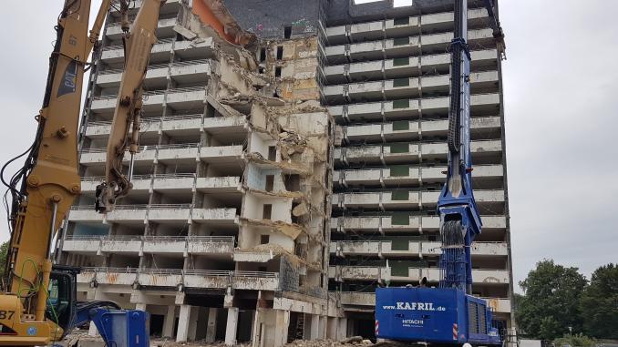 Jetzt steht wieder ein riesiger Abrissbagger vor der Hochhausruine. In kurzer Zeit soll das Gebäude flach liegen. Heute ist es üblich und Vorschrift solche Gebäude zuvor zu entkernen. Belastete Gebäudeteile sind zu entsorgen, Installationen zu entfernen. Was der Bagger jetzt noch zu Trümmern „zerbeißt“, kommt vor Ort in einen riesigen Schredder. Metalle werden aus dem Beton heraus gebrochen und sortiert.