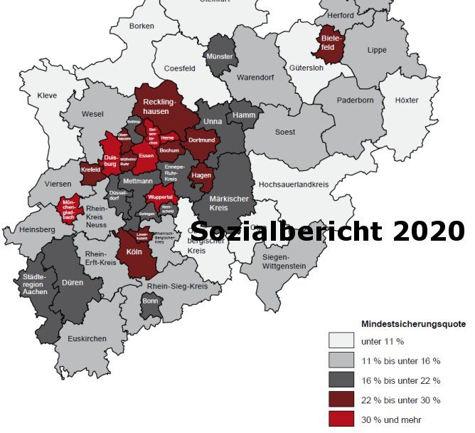 Während der gesamte Kreis Recklinghausen mit seinen 10 Städten im Schnitt eine Mindestsicherungsquote zwischen 22 und 30 % hat (Gladbeck 31,3 %), liegt der Wert nur in den Großstädten: Mönchengladbach, Duisburg, Essen, Wuppertal, Gelsenkirchen und Herne höher als 30 %.