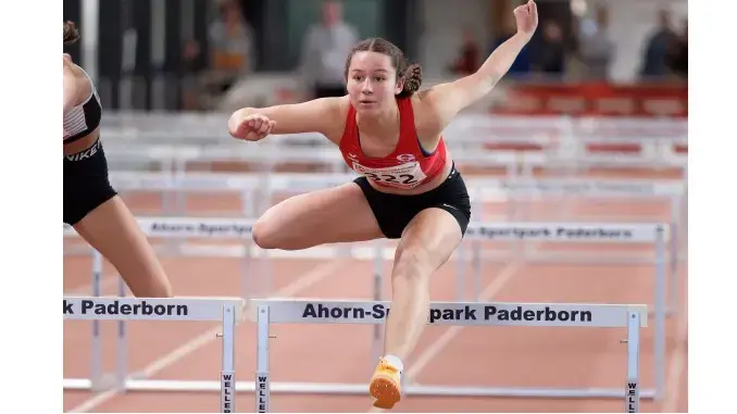 Abschneiden der Sportlerin Melina Sommerfeld bei den westfälischen Hallenmeisterschaften der Altersklasse U14 in Paderborn.