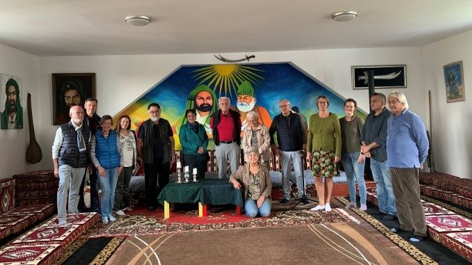 Im alevitischen Kulturverein am Linnerott wurde die Gruppe um Müzeyyen Dreessen und Dietrich Pollmann vom Vereinsvorsitzenden Tecer Ceylan empfangen, der mit weiteren Mitgliedern der Gruppe die Räumlichkeiten und die Arbeit vorstellte. Gegründet 1987, dient der Verein als Zentrum für die Aleviten in der Region. Zum Einzugsgebiet des Vereins zählen auch die Nachbarstädte von Gladbeck. Bei der Führung durch unterschiedliche Räume und den Gottesdienstraum konnte die Gruppe erfahren, dass der Standort in den 60er Jahren mal ein Heim für Arbeitskräfte aus unterschiedlichen Ländern war.