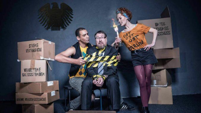 Da sitzen die Drei nun in einem überfüllten Materialraum des deutschen Parlaments und debattieren in einer bunten, witzigen und temporeichen Revue mit vielen Nummern und Songs über deutsche und deutsch-deutsche Befindlichkeiten zwischen Klimafrust, Bildungsnotstand und der ultimativen Frage, warum es überall nur noch Coffee to go gibt, aber draußen keine Kännchen mehr. Eintritt: 25 Euro auf allen Plätzen, zzgl. Gebühren.
