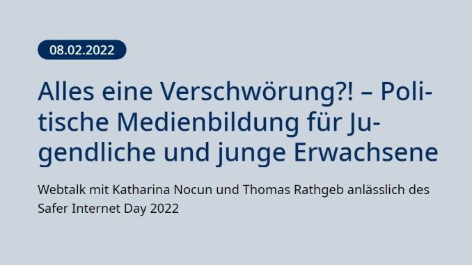 Anlässlich des diesjährigen Safer Internet Days greifen die Zentralstelle für Politische Jugendbildung im Deutschen Volkshochschul-Verband (DVV) und das Grimme-Institut diese Entwicklung auf: In einem Webtalk am Dienstag, 8. Februar, 16.30 bis 18 Uhr, diskutieren ExpertInnen unter dem Titel „Alles eine Verschwörung?“ über den aufgeklärten Umgang mit Messengergruppen, Verschwörungserzählungen und Corona-LeugnerInnen.