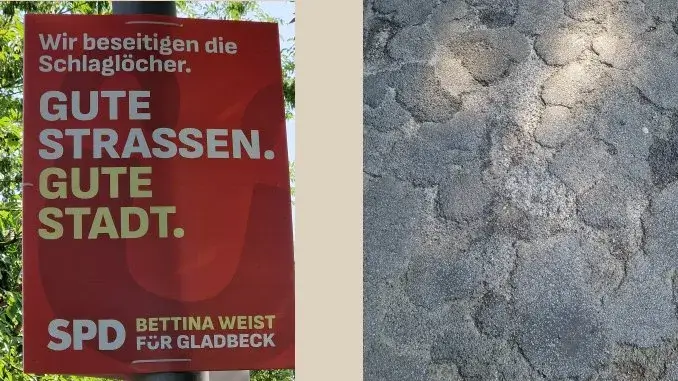 Gladbeck – 23.06.2025 – Wahlkampf – „Da kann man sich nur am Kopp packen!“, würde ein Ruhri zum aktuellen Kommunalwahlplakat der Gladbecker SPD sagen. Da hängt die Gladbecker SPD doch wirklich ein Plakat auf mit der Aufschrift: „GUTE STRASSEN. GUTE STADT.“ und darüber steht auch noch: „Wir beseitigen die Schlaglöcher.“