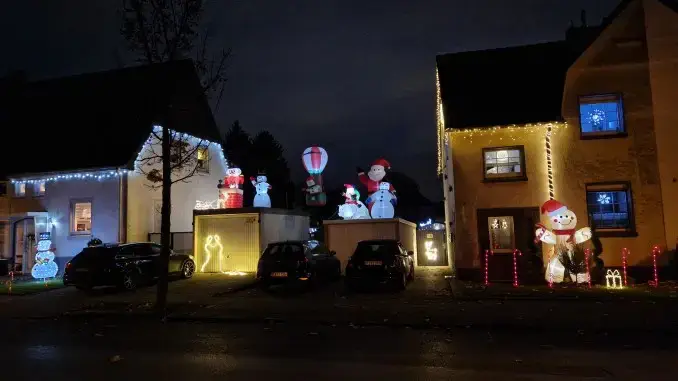 Seit vielen Jahren reicht es manchen Zeitgenossen nicht mehr, ihr trautes Heim nur von innen weihnachtlich zu schmücken. Die Begeisterung stellt man heute gern nach außen zur Schau. Manche Weihnachtsdeko wird dann zum Publikumsmagnet und ganze Familien wandern in den dunklen Abendstunden durch die Stadtteile, um den Kindern eine Freude zu machen. Längst haben die Motive christlicher Weihnacht den bekannten Disneyfiguren den Platz räumen müssen. Auch beleuchtete, aufblasbare Schneemänner sind ein wichtiges Bestandteil der Ausstattung.