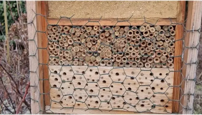 Holzwolle oder Zapfen gehören nicht in einen Nistkasten, da sie Ohrenkneifer anziehen, die dann die Brut fressen. Ein Maschendraht kann die Brut vor Spechten schützen. So ist die Unterstützung für Wildbienen gewährleistet.