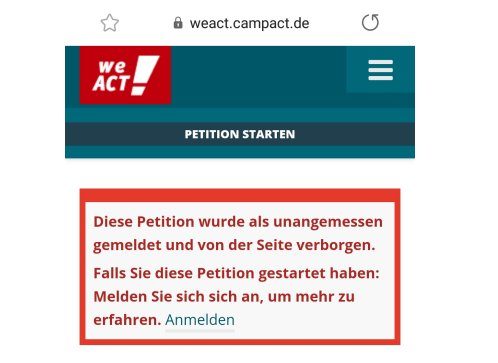 Die Petitionsplattform, die mit dem Slogan „WIR BEWEGEN POLITIK – GEMEINSAM“ für sich wirbt, hatte die Petition kurzerhand wieder offline gesetzt.