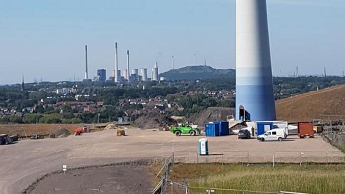 17.06.2021 – Windrad wird weitergebaut – Das wird das Gladbecker Bürgerforum nicht in Jubelstimmung versetzen: Das Windrad auf der Mottbruchhalde wird bald weitergebaut. Derzeit ist der große Kran abgezogen. Viele Windradgegner hatten schon gehofft, dass der Baustillstand endgültig sei. Doch tatsächlich sind jetzt nur die Betonarbeiten abgeschlossen und innerhalb des Betonturms finden nun Ausbauarbeiten statt. Mit Stahlseilen verspannt erlangen die Betonteile die nötige Standfestigkeit.