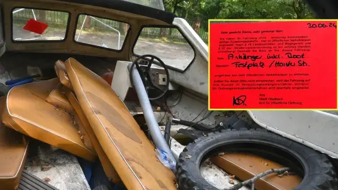 Der wird sagen: „Wie, ist „umgehend“ nun schon vorbei?“ Denn eine konkrete Frist zur Beseitigung von Boot und Hänger vom Festplatz-Parkplatz ist auf dem Aufkleber des Gladbecker Ordnungsamtes nicht genannt.