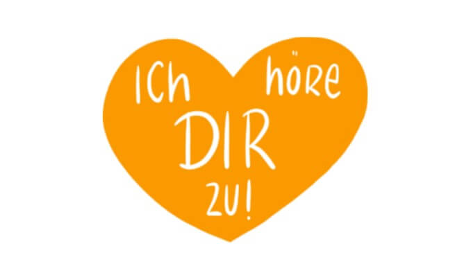 Die ZuhörerInnen sind leicht zu erkennen: Sie tragen ein Schild mit dem orangefarbenen Herz-Logo und der Aufschrift „Ich hör dir zu“.